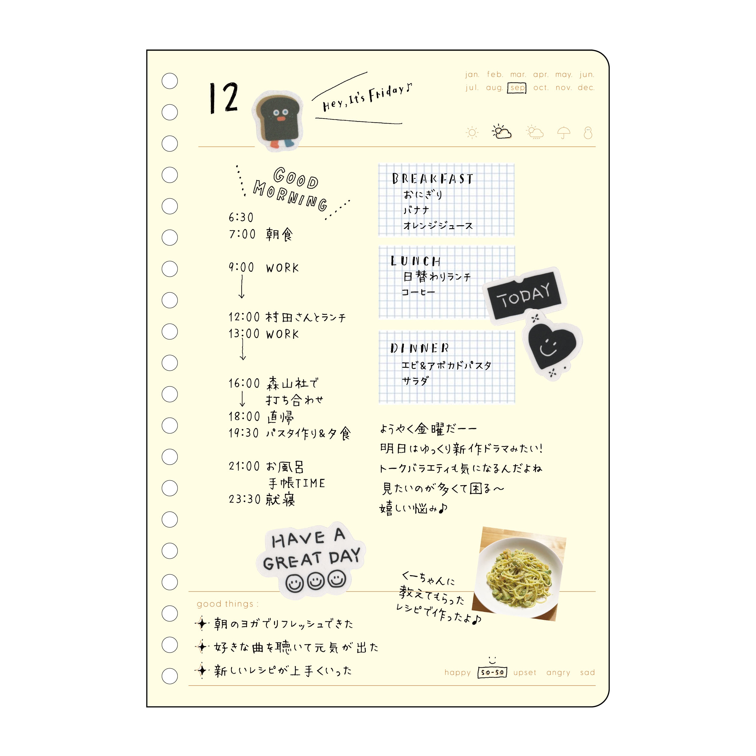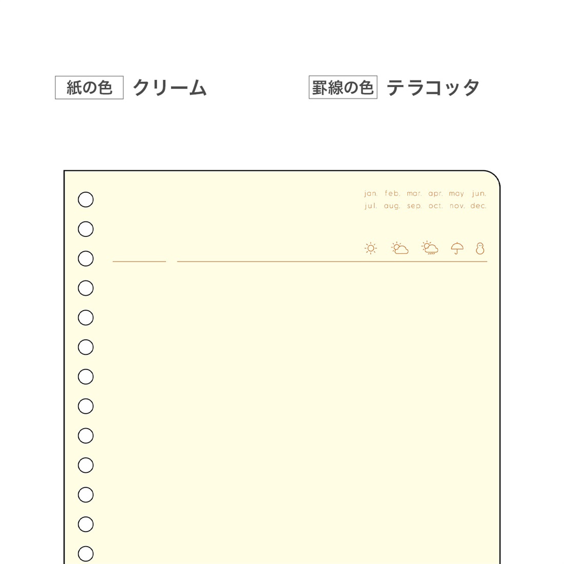 サイズ:H210.0×W148.0×D4.0mm 重量:80.0g 素材:紙 A5正寸・20穴・32枚入(デイリー2ヶ月分) パッケージ:PP袋入 原産地:JAPAN